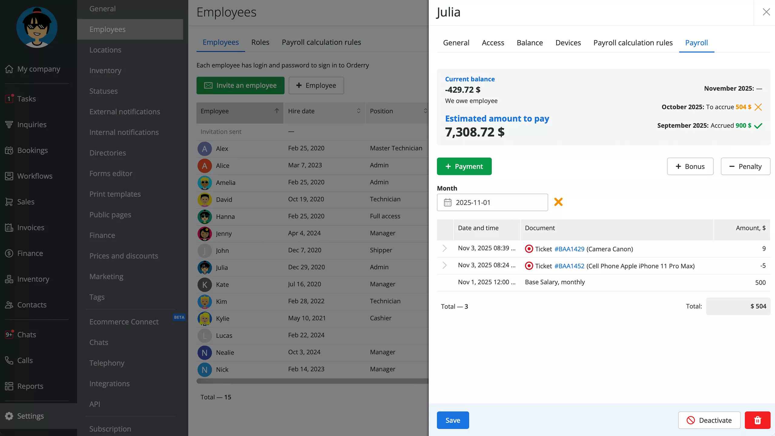 The program for funeral services also manages your payroll process so you can reduce the impact of human error in your admin work. Configure base salaries, commissions, penalties, and bonuses for funeral directors and cemeterians, and Orderry will automatically display the final amount to be paid. Accrue salaries to individual balances and make payouts at custom frequencies.